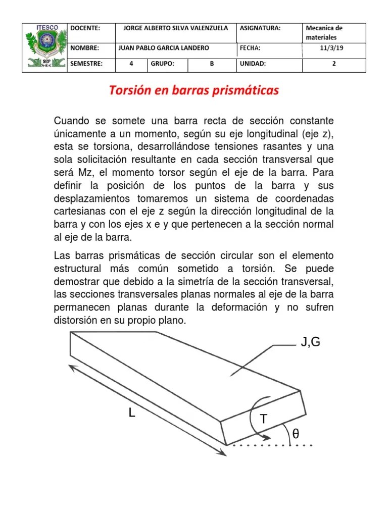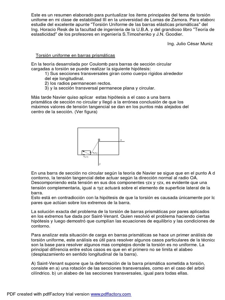 2.2.1.propiedades mecnicas de los materiales las propiedades mecnicas pueden definirse como aquellas que tienen que ver con el comportamiento de un material bajo fuerzas aplicadas. Se define barra prismática o pieza prismática como el volumen engendrado por el movimiento de una sección plana a (que puede tener huecos en su interior) al recorrer su centro de gravedad g una curva plana que se denomina directriz o eje de la pieza, manteniéndose la sección a normal a la directriz y permaneciendo durante el movimiento uno de sus … Barra recta de sección circular consideremos un barra recta de sección circular empotrada en uno de sus dos lados, sobre la cual actúa un momento torsor; Del cronista isidoro valverde, edif.